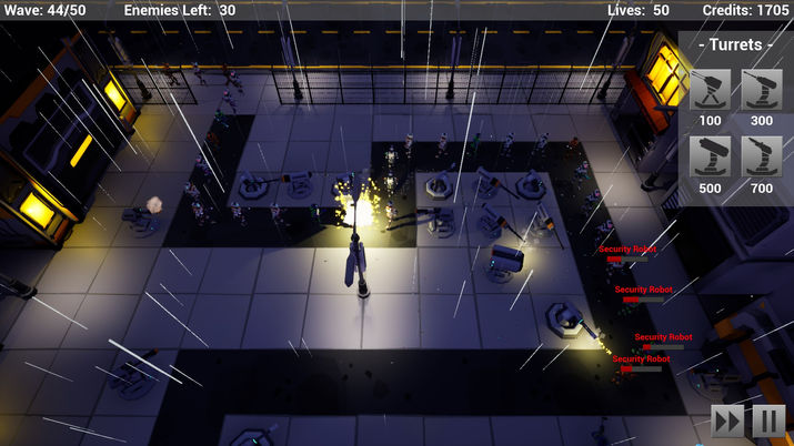 Finally, after a complete game was in place, I decided to spend more time polishing the game and improving the look and feel. Here definitely made up for the tedious month of game balancing as this is where I built the world, added particle systems, made sound effects and best of all added ragdolls. The last thing I did however showed me how much you can make the game pop in a way it didn’t before. Rather than leaving it there, I tried to add a deeper feel to the game. I did this by moving away from the boring clear, bright and sunny look and instead opted for the dark, miserable rainy night scene. Even if on the nose of sci-fi city stereotypes, it clearly works!